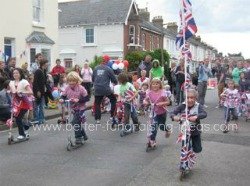 The real highlight of the day however was the Scooter Parade which we used to start proceedings. All the children had decorated their scooters and themselves in all sorts of wonderful ways. We lined the adults along either side of the street and the kids (and one game pensioner dressed as Britania) scooted along whilst everyone cheered and clapped. The whole thing made more memorable by having the theme to the Dam Busters playing. At the end of the street the town Mayor took the 'Scooter Salute!'. It was brilliant fun and very very funny. A totally wonderful way to start off what turned out to be a great day for all the community. If you are looking for an easy but popular addition to any fundraising event you are organising I recommend a Scooter Parade it was a real winner! Neill Wilkins